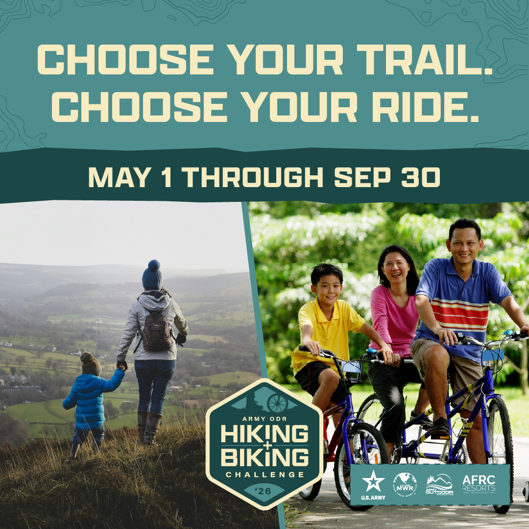 Family and MWR Outdoor Recreation is calling all hiking and bicycling enthusiasts to join the 2026 Army Outdoor Recreation Hiking and Biking Challenge. Can you hike or ride, 250km, 500 km or 1000km (621 miles) over 5 months? Hike or ride outdoors on roads & trails starting May 1 through September 30. The challenge is open to all authorized FMWR patrons. The entry fee is $50 per individual or $50 per family. All participants will receive a commemorative Hiking or Biking jersey! One jersey per individual or family registration; additional jerseys available for purchase. Each participant is responsible for their own distance tracking and record keeping. When you have conquered the goals of 250km, 500 km and 1000 km, report your results back to Outdoor Recreation. Earn interlocking challenge coins as you complete the challenge goals for Biking. One coin per individual or family registration. Earn commemorative patches as you complete the challenge goals for Hiking. One patch per individual or family registration. Families are encouraged to hike and or ride together and combine their miles toward the collective goal. For more information or to register, call MWR Outdoor Recreation at (520) 533-6707.