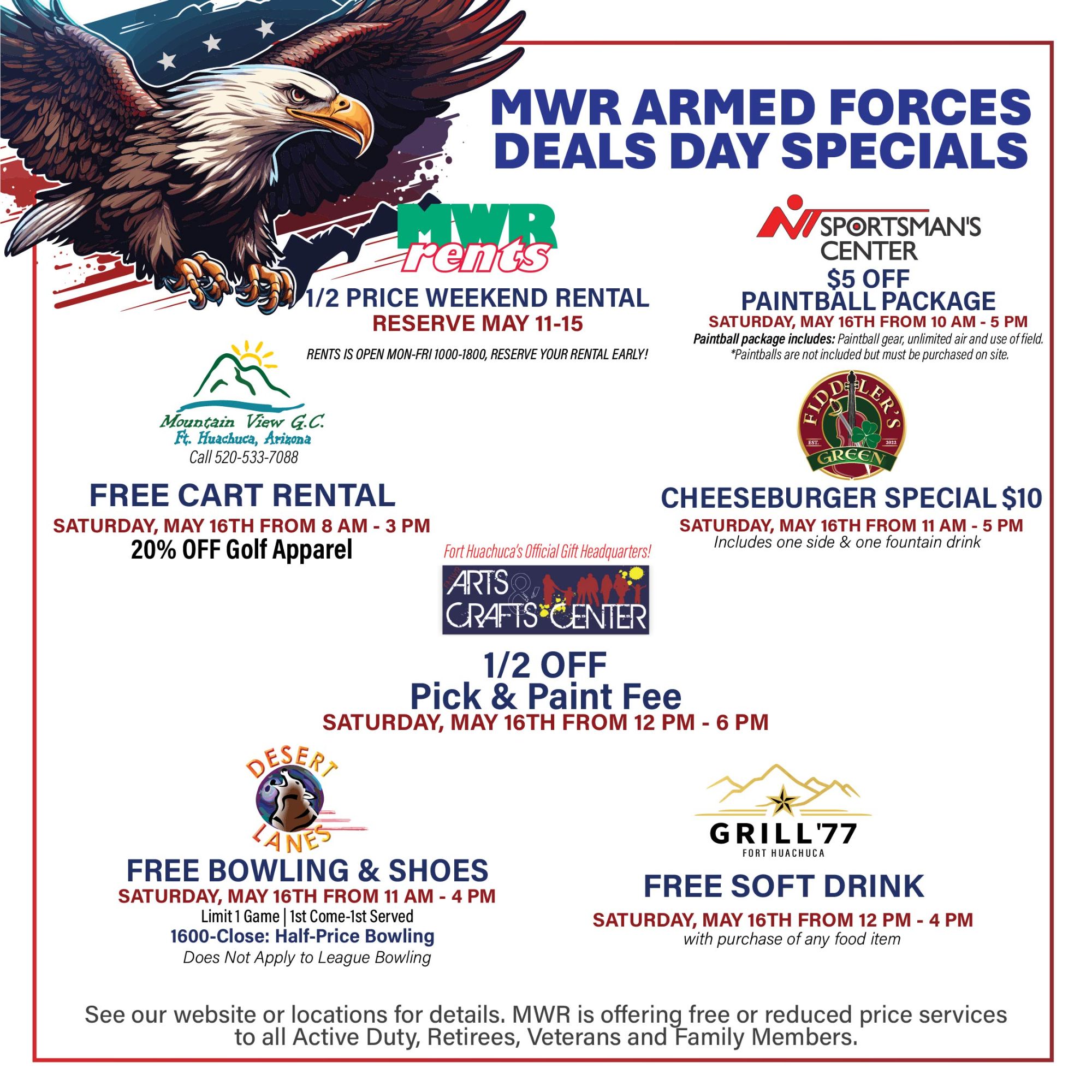 Celebrate Armed Forces Day with MWR! Many of our facilities and programs will offer free or discounted services on May 16th to all Active Duty, Retirees, Veterans and Family Members. Look for great deals at Arts & Crafts Center, Desert Lanes Bowling Center, Fiddler's Green, Grill '77, Mountain View Golf Course, MWR Rents and Sportsman's Center.