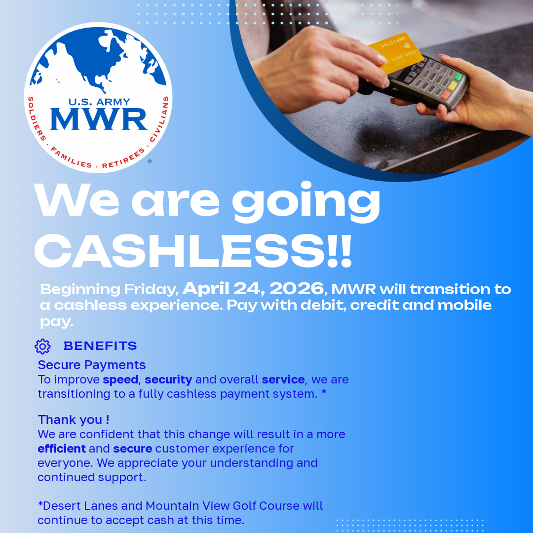 Fort Huachuca Family and MWR will transition to cashless operations effective April 24 across designated facilities.