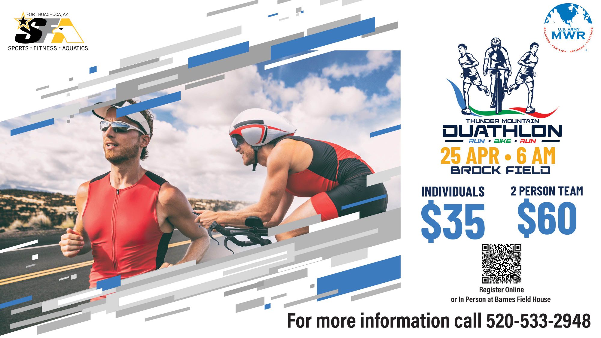 Join the team at Sports, Fitness & Aquatics for the Thunder Mountain Duathlon on Saturday, April 25, 6 AM at Brock Field. A duathlon is a multisport endurance event combining running and cycling. This is a run-bike-run event. Individuals register for $35 and $60 per 2-person team. Register online at raceentry.com or at Barnes Field House. For more information, call 520-533-2948.