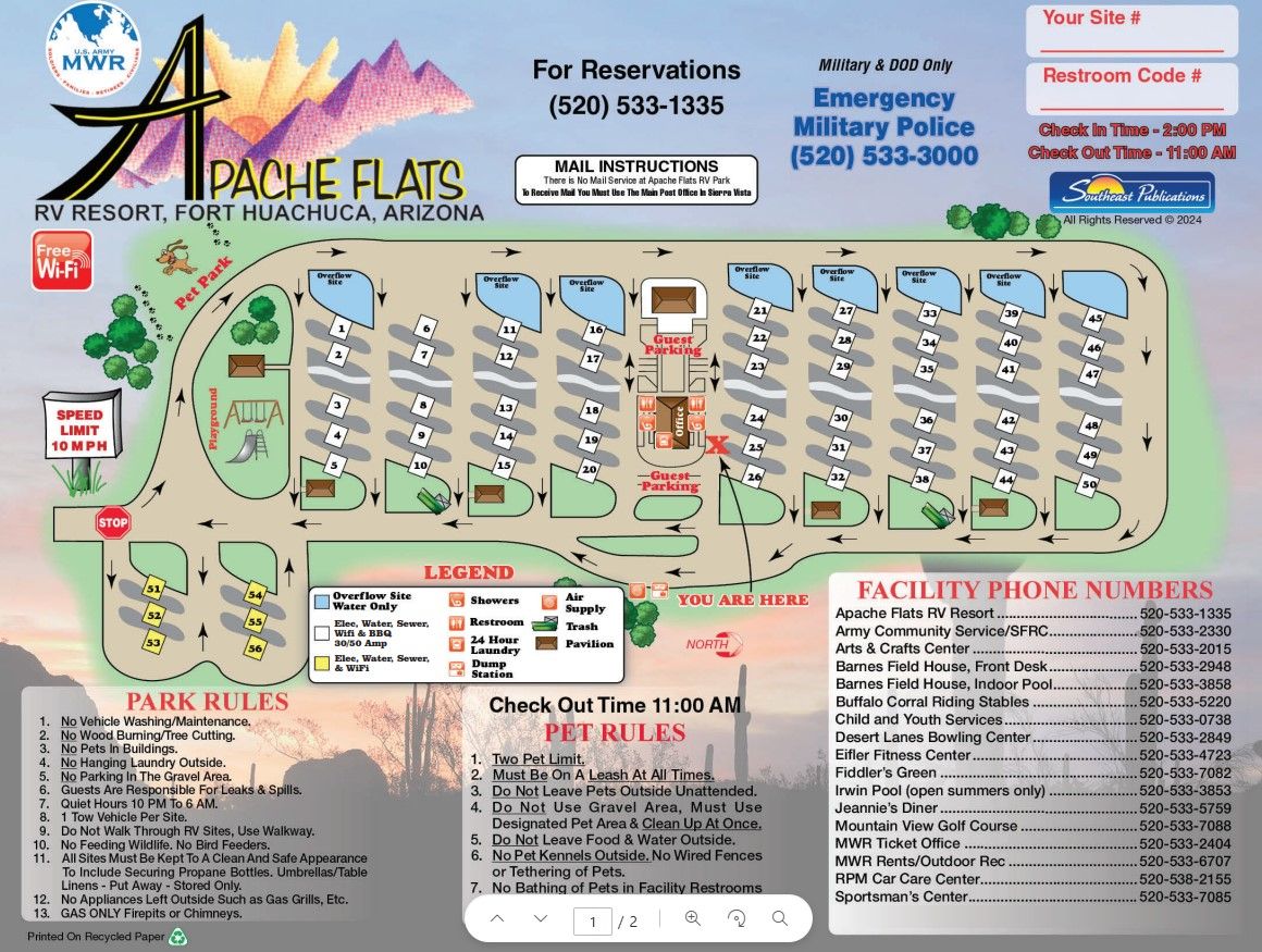 The Apache Flats RV Resort is located at the foot of the Huachuca Mountains, offering beautiful views and numerous hiking trails. The resort is a paradise for bird lovers and hikers alike. Fort Huachuca is nearby and offers many exciting and interesting activities. Reservations are made for Authorized Personnel (Active or Retired Military), DAV with valid ID cards and DoD ID Cardholders.