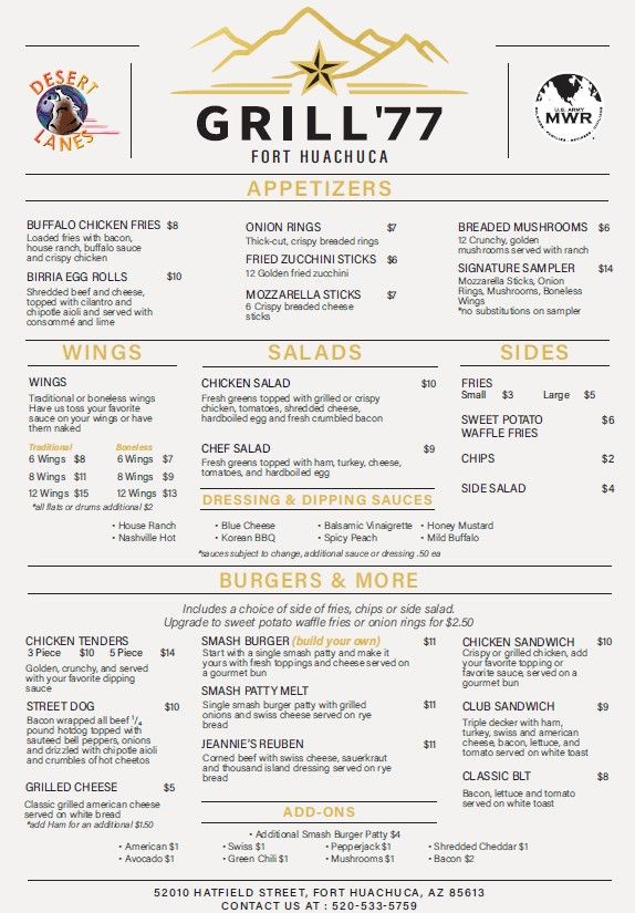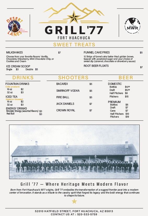 Born from Fort Huachuca’s 1877 origins, Grill ’77 embodies the transformation of a rugged frontier post into a modern center of innovation. It stands as a tribute to the cavalry spirit that forged its legacy and the bold energy that continues to shape its future. Grand Opening December 1 from 3-5 PM inside Desert Lanes Bowling Center with free food samples and chances to win 1 of 2 flat top grills. For information call 520-533-5759.