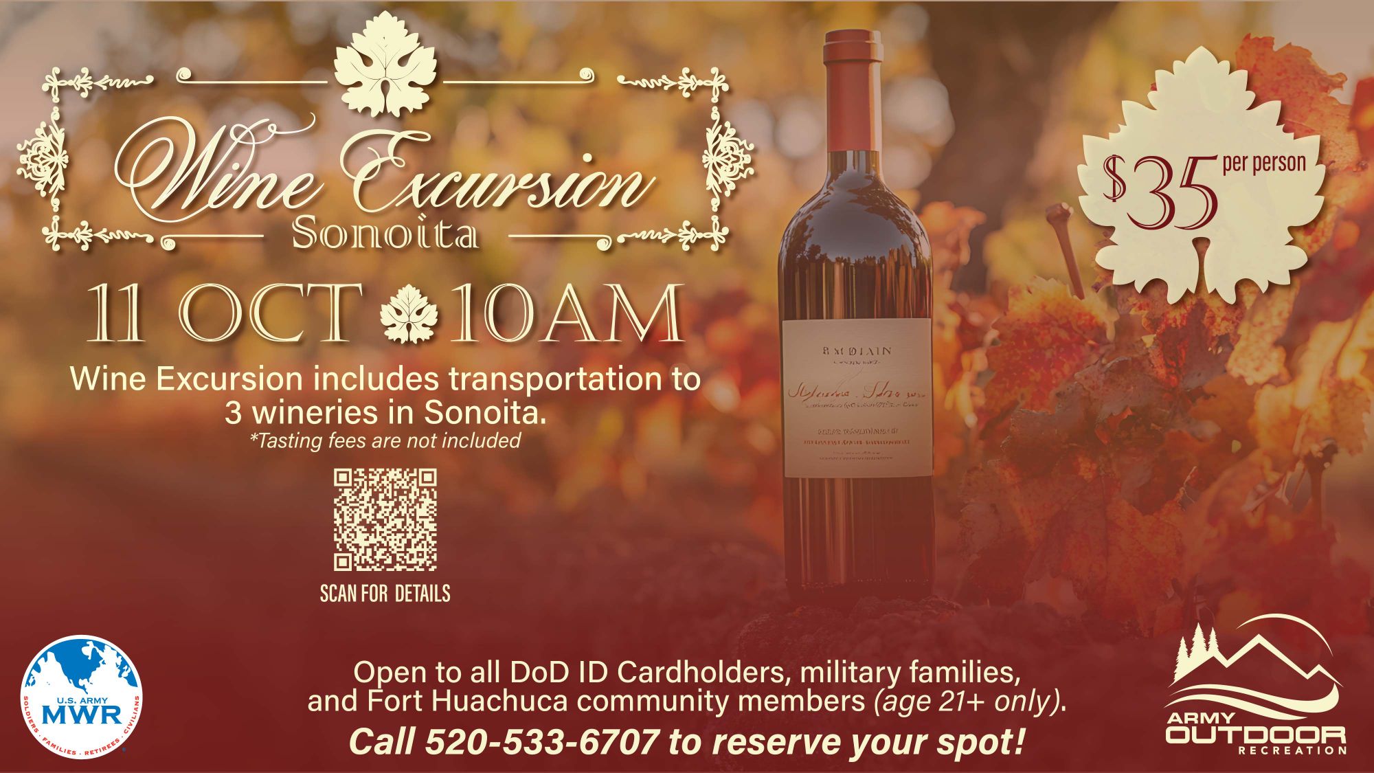 Did you know Southern Arizona has great wineries? Yes! MWR Outdoor Recreation is excited to offer Wine Excursions! We’ll drive your group to three locations, so you can enjoy a good time with friends. Open to MWR Patrons 21+, (sorry no children). Winery tasting fees not included. Spaces are limited, call 520-533-6707 to book your group TODAY!